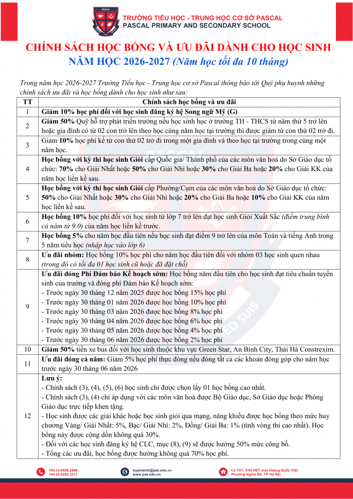 Chính sách ưu đãi và học bổng năm học 2026 – 2027