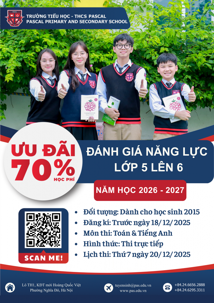 Để khích lệ và tạo cơ hội cho các học sinh giỏi xuất sắc được phát huy năng lực trong môi trường giáo dục hiện đại, hội nhập quốc tế, đồng thời là dịp để cho các con học sinh được giao lưu, học hỏi, Trường Tiểu học – THCS Pascal tổ chức Kì thi Đánh giá năng lực dành cho học sinh lớp 5 lên 6 năm học 2026 – 2027 với mức ưu đãi học bổng lên tới 70% học phí.